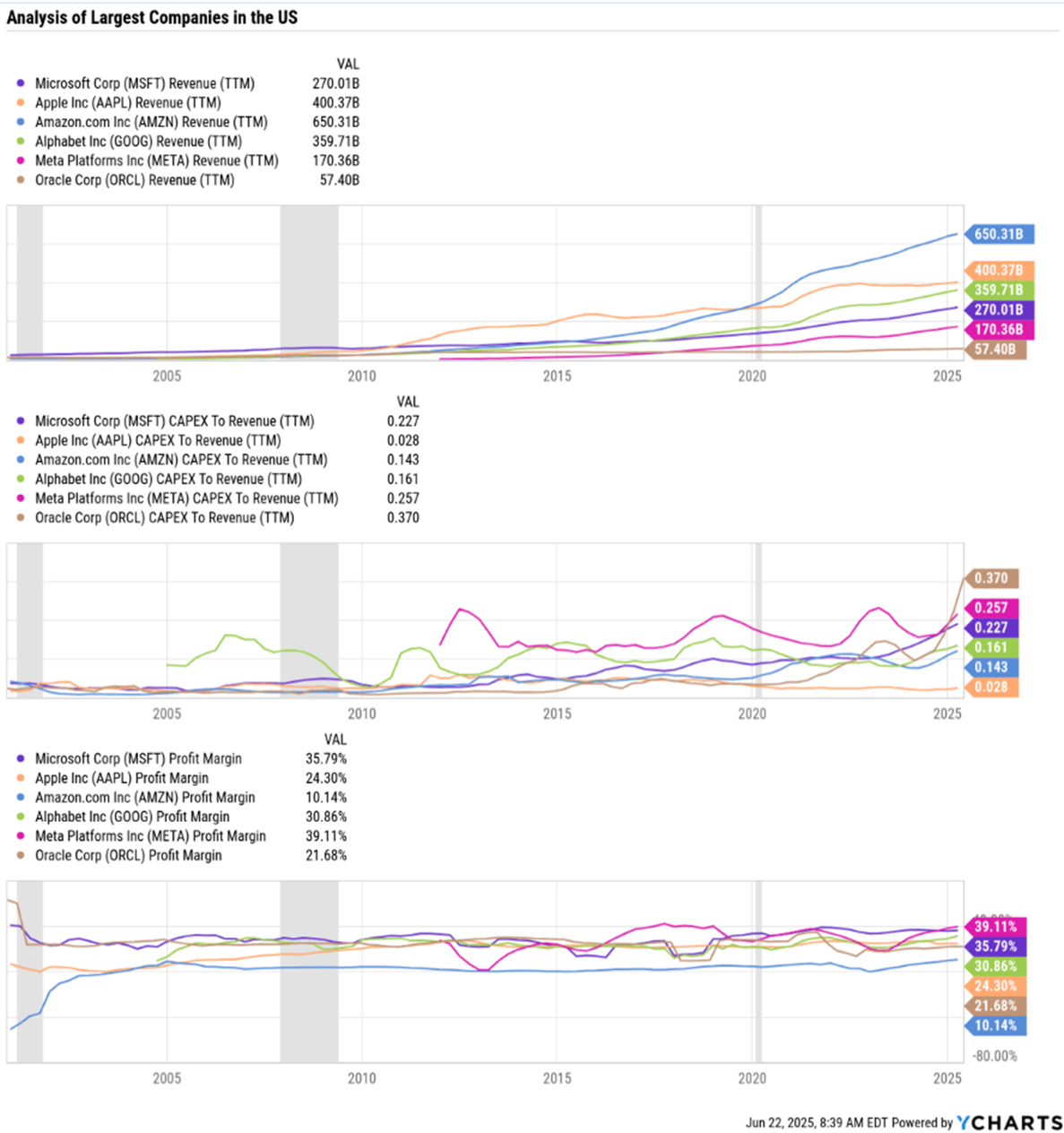 Nevertheless, one thing to monitor is the heightened level of expense related to the boom in Artificial Intelligence spending. Amazon, Apple, Microsoft, Meta and Alphabet, plan to dramatically increase Capital Expenditure as a percentage of their sales. Microsoft, Oracle and Meta are spending more than 20% of their revenue on capital expenditure, while Amazon is spending over $90billion. The total annual amount, $400 to $500billion, is on a government-level scale. For example, the “Inflation Reduction Act” promised to spend between $40bn and $80bn a year, while the ECB’s 2011 stimulus amounted to $1trn adjusted to 2025 dollars.